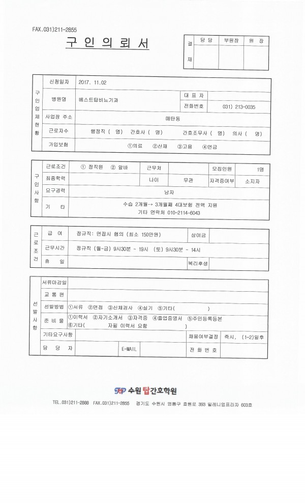 | 제목 | 베스트탑비뇨기과 (남자) 채용공고입니다. | 작성일 | 17-11-03 08:42 |